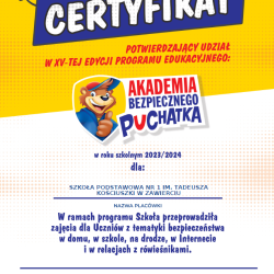 Ogólnopolski Program "Akademia Bezpiecznego Puchatka" jest skierowany do uczniów klas pierwszych. W ramach tego programu nasi uczniowie brali udział w zajęciach dotyczących bezpieczeństwa w domu, w szkole, na drodze, w internecie, w relacjach z rówieśnikami. Na zakończenie pierwszaki wypełnili test bezpieczeństwa.